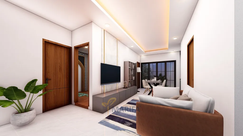 Ruang tamu terasa seperti ruang transisi yang menerima setiap tamu dengan tenang. Pencahayaan indirect dari langit-langit menciptakan atmosfir hangat tanpa harus mengandalkan cahaya lampu yang tajam. Dari sini, aliran ruang bergerak menuju area keluarga, dapur, dan kamar tidur—semuanya diatur agar mendapatkan sirkulasi udara yang memadai.