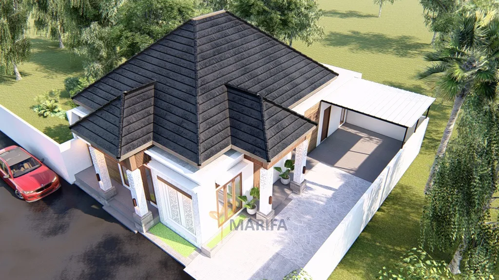 Atap rumah ini menggunakan bentuk tropis modern dengan kombinasi kemiringan yang cukup untuk mengalirkan air hujan dan memberikan rongga udara sebagai insulasi panas. Rangka atap menggunakan baja ringan yang tahan terhadap korosi dan memiliki kekuatan tinggi.